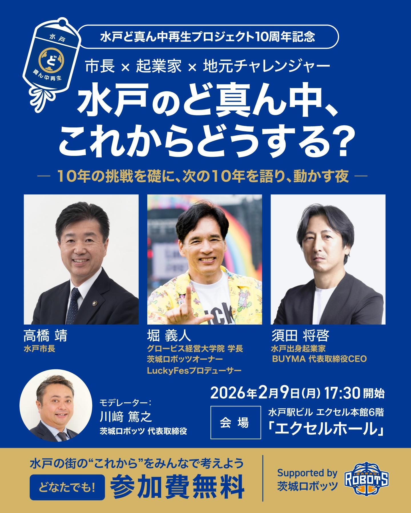 本フォーラムでは、これまでの10年間の取り組みを振り返るとともに、今後の新たなプロジェクト展開や、これからの水戸のまちをさらに動かしていくために何が必要かについて、水戸市長・高橋靖氏、株式会社エニグモ「BUYMA」代表・須田将啓氏を迎え、当プロジェクトの座長であるグロービス経営大学院学長 ・堀義人と共に、トークセッション形式で大胆に議論します。